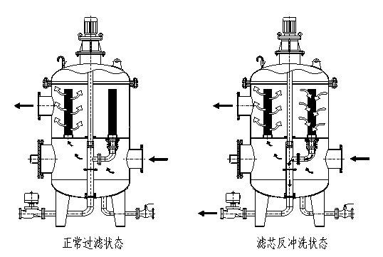 正常過濾狀態:排污口閥門關閉。取自自然的江水、河水由濾水器上腔進水口進入,水中的塑料泡沫、樹枝、水草以及直徑大于隔板欄污柵孔徑的顆粒留在濾水器上腔,并由上排污閥排出。較為清潔的水經導流管流至下腔,水到下腔后,一些沙粒可沉到底板沉沙室內,沙粒可由沖排泥沙出口排出。下腔的水從下隔板的孔流入V形楔式不銹鋼過濾網管,過濾后的清潔水從濾水器中間的出水口流出。